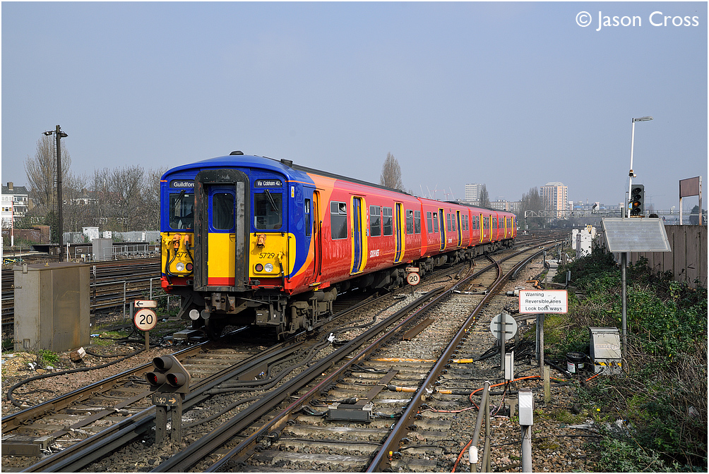 Class 455 5729 heads away from Clapham Junction with a Guildford to London Waterloo service. Date: 12 March 2016 Manipulation Notes: None