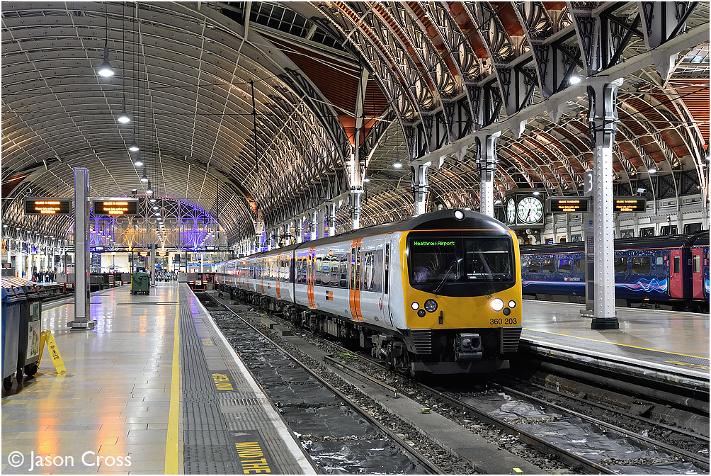 360203 in platform 3 at Paddington with the 2T64 1833 London Paddington to Heathrow Airport Terminal 5. Date: 14 January 2017 Manipulation Notes: None