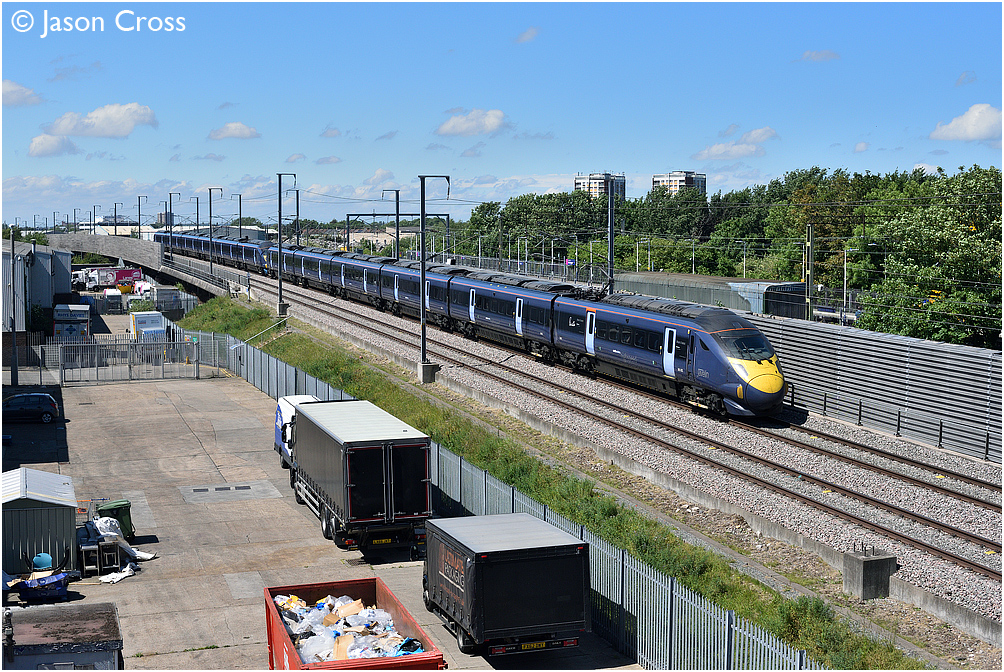 A pair of class 395 Javelin units led by 395002 race through Rainham with 1J38 1409 St Pancras International to Margate. Date: 27 May 2017 Manipulation Notes: None