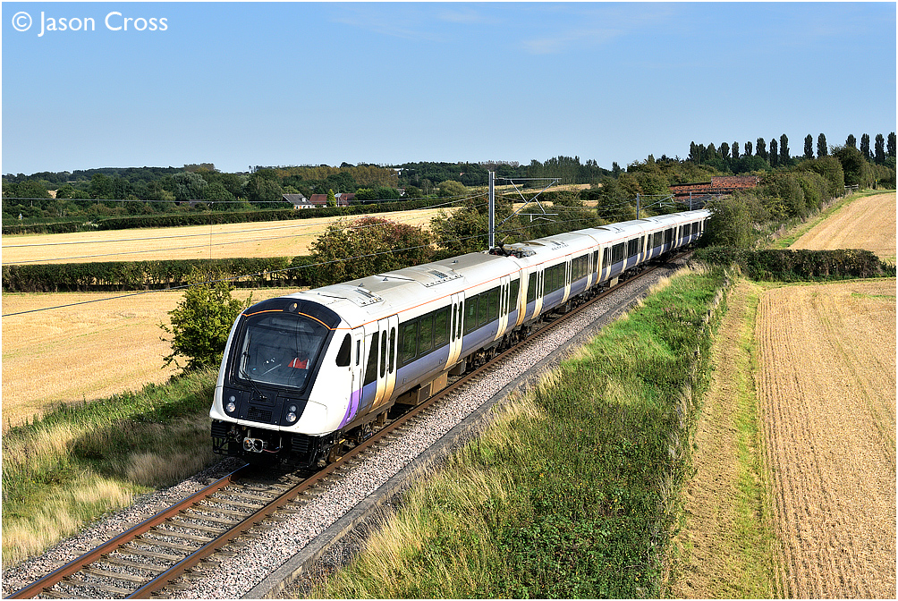 9-car 'Crossrail' unit 345018 on test on the Old Dalby test track at Stanton-on-the-Wolds. Date: 25 August 2017 Manipulation Notes: None Camera mounted on a tall pole and remotely fired