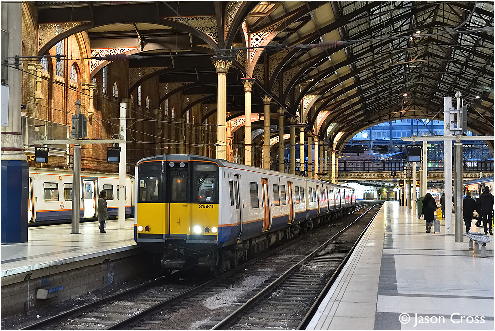 315811 arrives at London Liverpool Street with the 2U57 1622 from Enfield Town. Date: 10 February 2018 Manipulation Notes: None