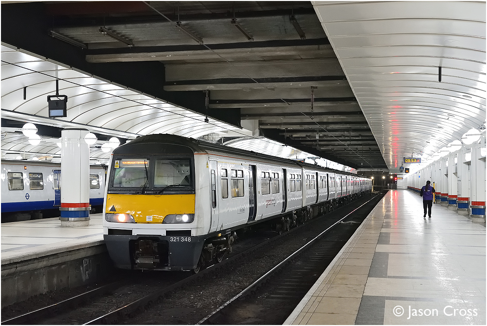 321348 arrives at London Liverpool Street with the 1K41 0852 from Southend Victoria. Date: 20 February 2018 Manipulation Notes: None