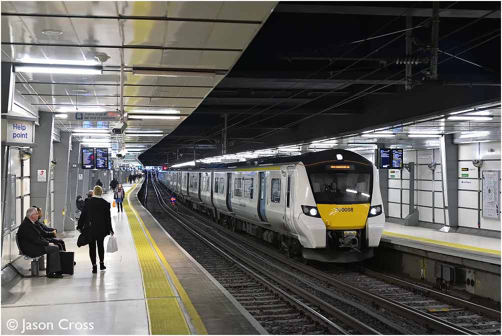 700008 departs from City Thameslink with the 2E85 1200 Sevenoaks to West Hampstead Thameslink service. Date: 20 February 2018 Manipulation Notes: None