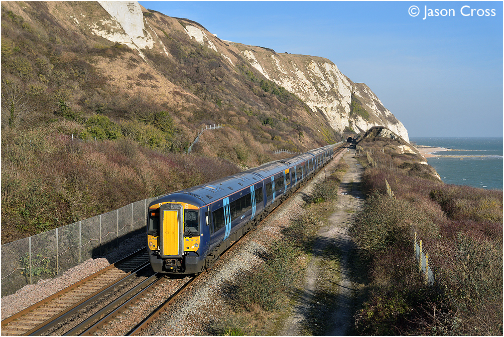 375617 and 375714 pass Folkestone Warren with the 2W50 1458 Dover Priory to London Charing Cross. Date: 24 February 2018 Manipulation Notes: None