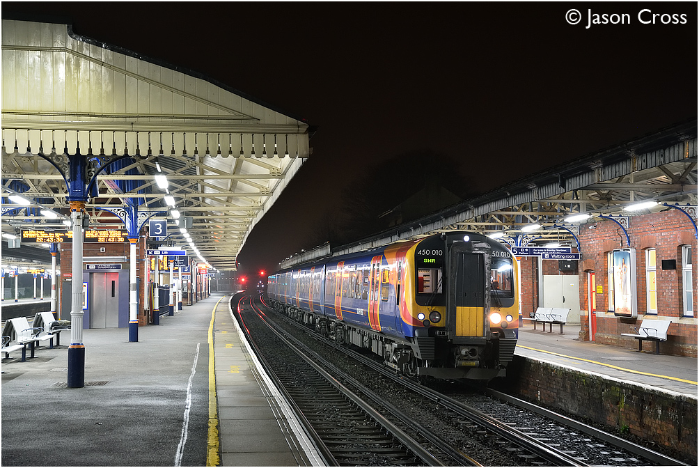 450010 stands at Basingstoke after arriving with the 2B80 2155 from Southampton Central. Date: 24 March 2018 Manipulation Notes: None