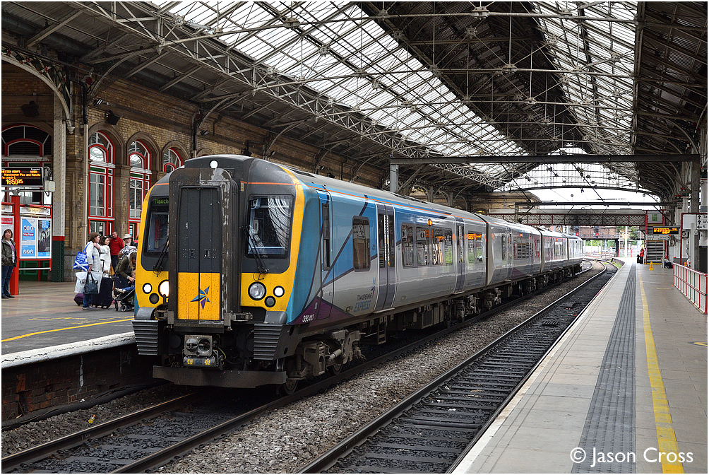 350410 stands at Preston with the 1M99 1418 Edinburgh to Manchester Airport. Date: 27 August 2018 Manipulation Notes: None