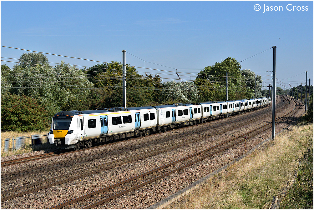 Heading north at Great Paxton, 700009 works the 1P18 0916 London Kings Cross to Peterborough. Date: 1 September 2018 Manipulation Notes: None Camera mounted on a tall pole and remotely fired