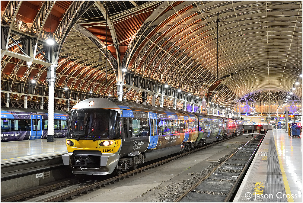 332002 waits to depart from London Paddington with a Heathrow Express service. Date: 7 September 2018 Manipulation Notes: None