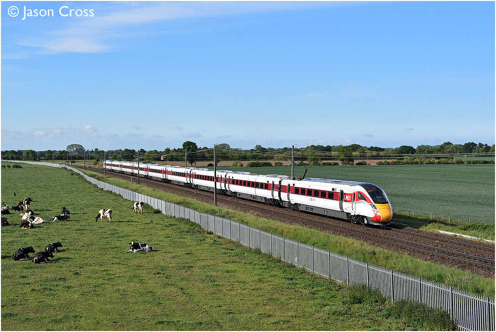 800110 at North Muskham with a Ferme Park to York test run. Date: 25 May 2019 Manipulation Notes: None Camera mounted on a tall pole and remotely fired