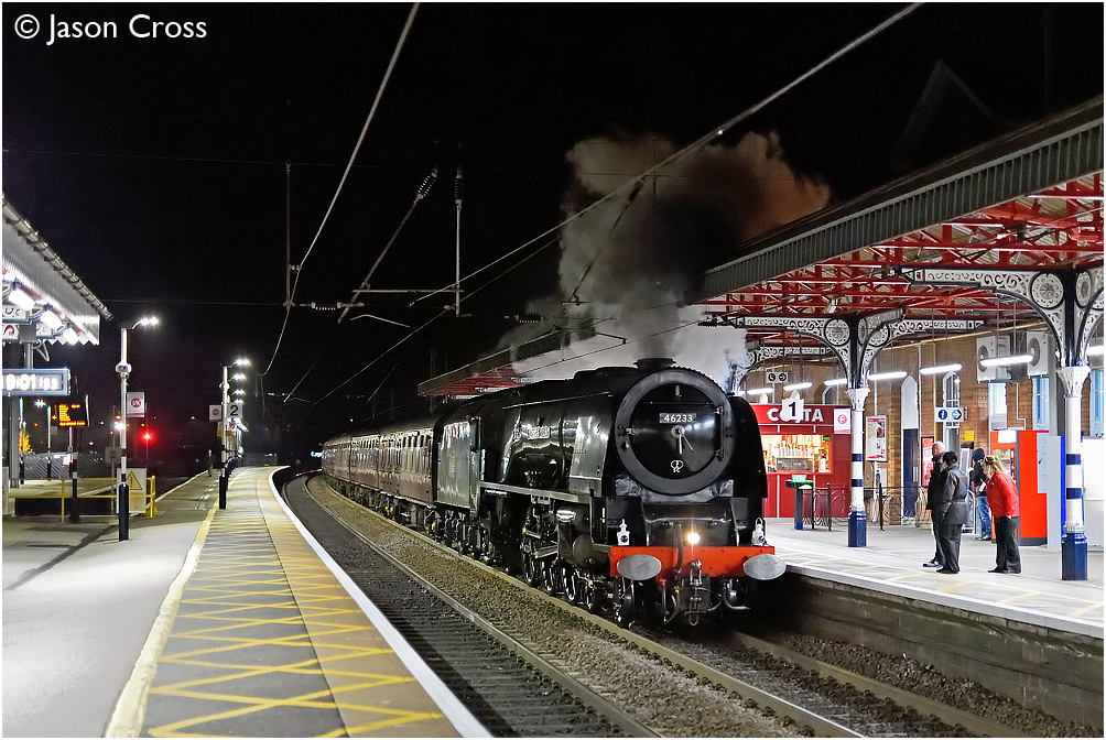 46233 'Duchess of Sutherland' races through Grantham with a 1Z48 1741 Lincoln Central to London King's Cross steam special. Date: 5 December 2015 Manipulation Notes: None
