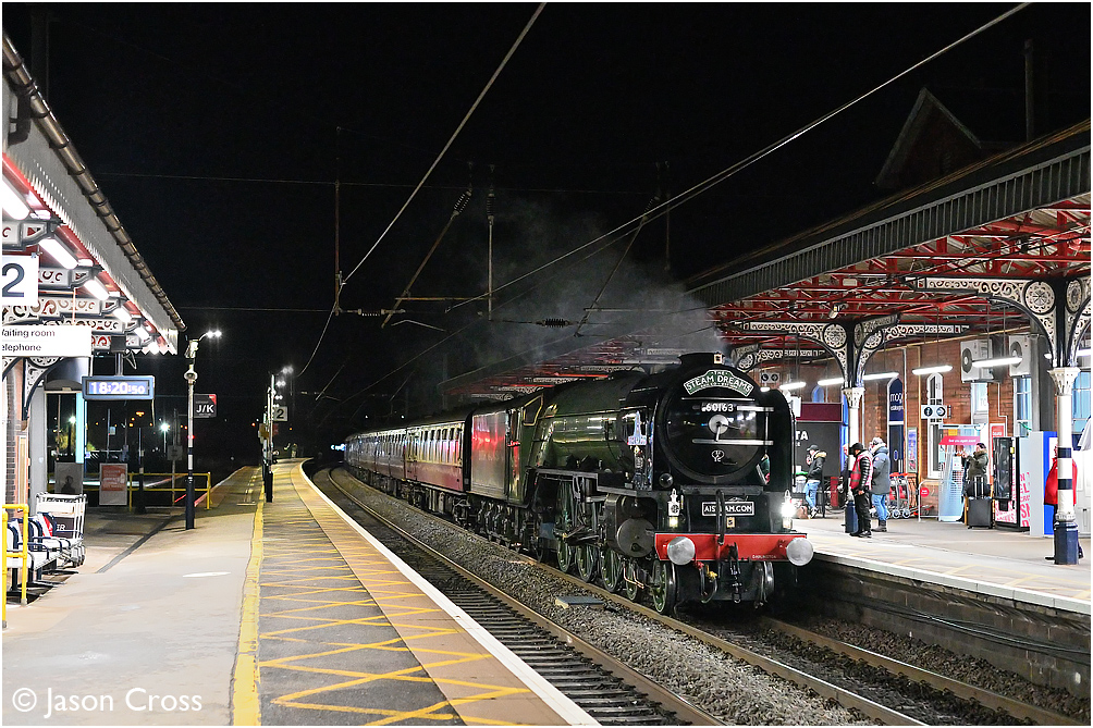 A1 60163 'Tornado' races through Grantham with a Lincoln Central to Ealing Broadway charter train. Date: 8 December 2019 Manipulation Notes: None