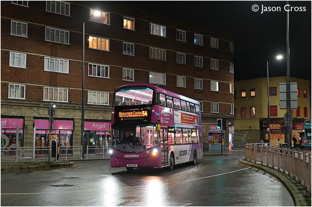 First Leicester 35184 at Haymarket Bus Station with a 54 Goodwood to Beaumont Centre service. Date: 16 January 2021 Manipulation Notes: None