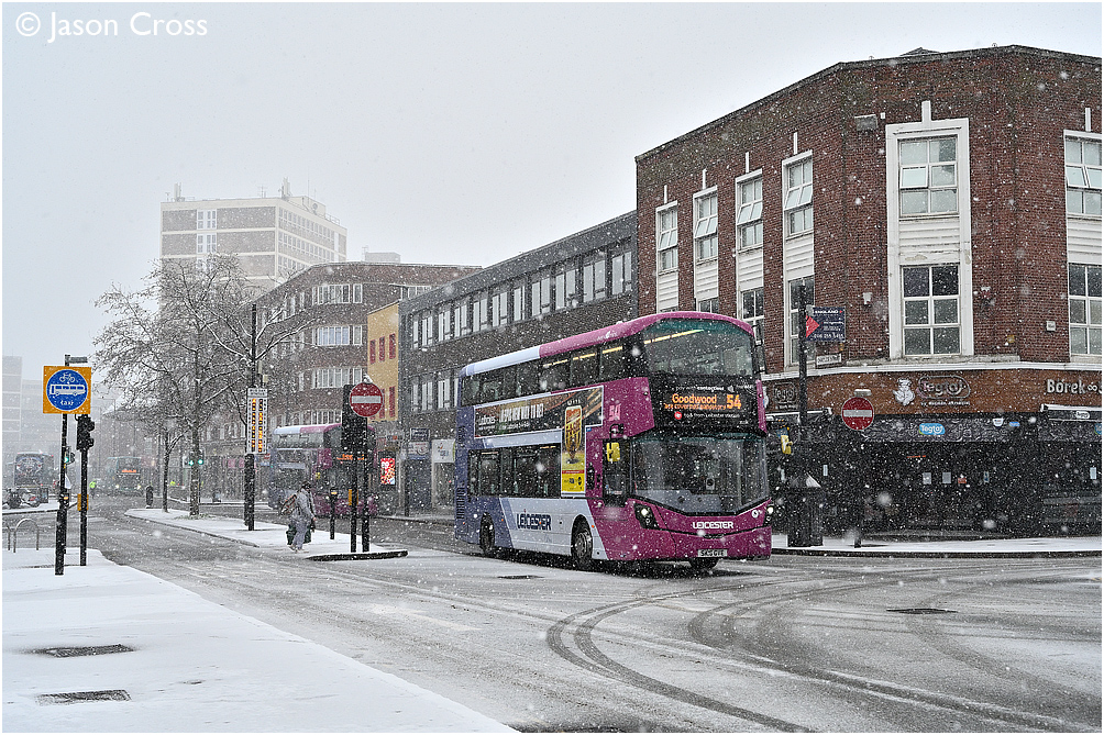 Leicester Buses in the Snow - First Leicester 35184 on Charles Street with a 54 Beaumont Centre to Goodwood. Date: 24 January 2021 Manipulation Notes: None