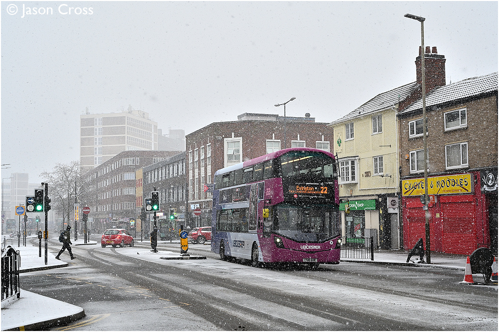 Leicester Buses in the Snow - First Leicester 35172 on Charles Street with a 22 Rushey Mead to Evington service. Date: 24 January 2021 Manipulation Notes: None