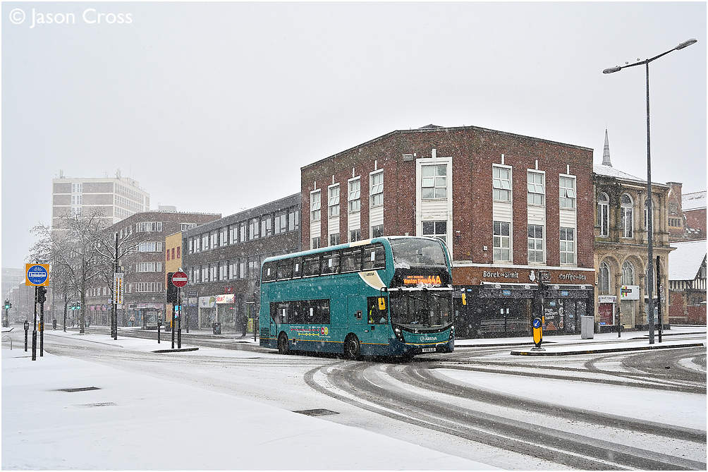 Leicester Buses in the Snow - Arriva's 4514 with a Haymarket to Wigston Magna 44A service crossing the junction with Humberstone Gate on Charles Street. Date: 24 January 2021 Manipulation Notes: None