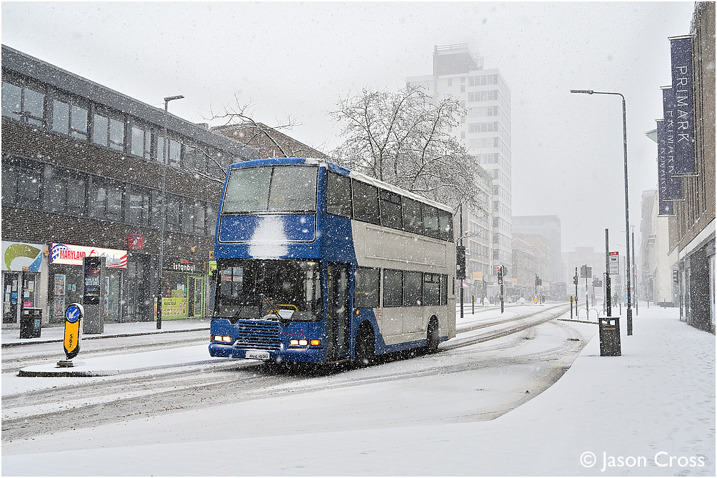 Leicester Buses in the Snow - AGZ 1680 on Charles Street while working a private staff special. Date: 24 January 2021 Manipulation Notes: None