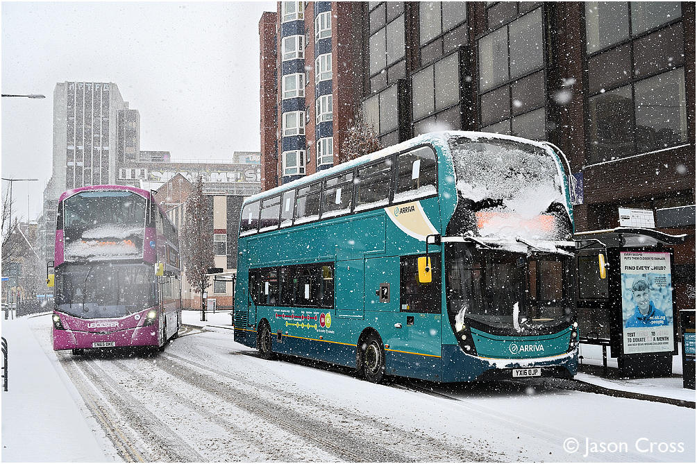 Leicester Buses in the Snow - Arriva 4515 and First Leicester 35153 on Humberstone Gate. Date: 24 January 2021 Manipulation Notes: None