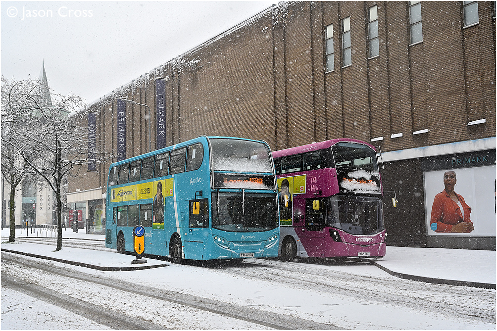 Leicester Buses in the Snow - First Leicester 35153 parked up on Charles Street is passed by Arriva's 4419. Date: 24 January 2021 Manipulation Notes: None