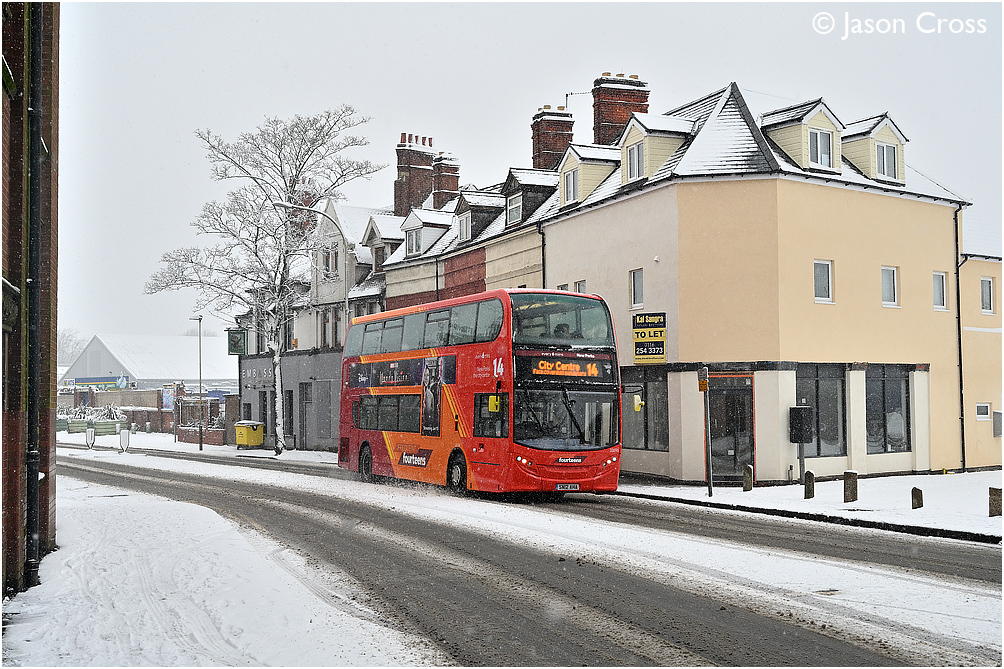 Leicester Buses in the Snow - First Leicester 33696 on Woodgate with a 14 Ryder Road to City Centre service. Date: 24 January 2021 Manipulation Notes: None