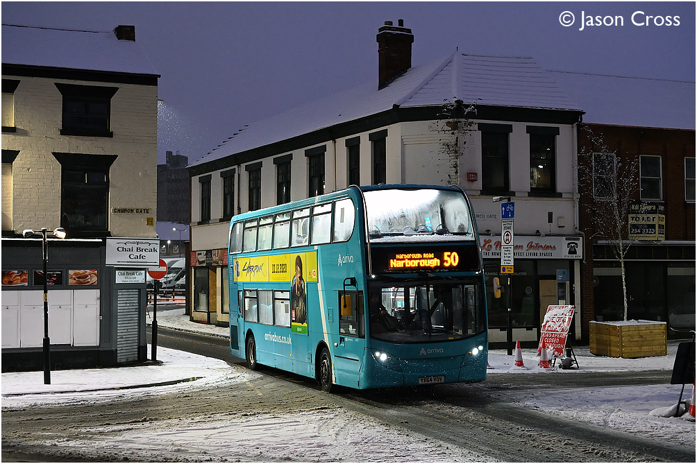 Leicester Buses in the Snow - Arriva 4419 crosses Church Gate with a 50 City Centre to Narborough service. Date: 24 January 2021 Manipulation Notes: None
