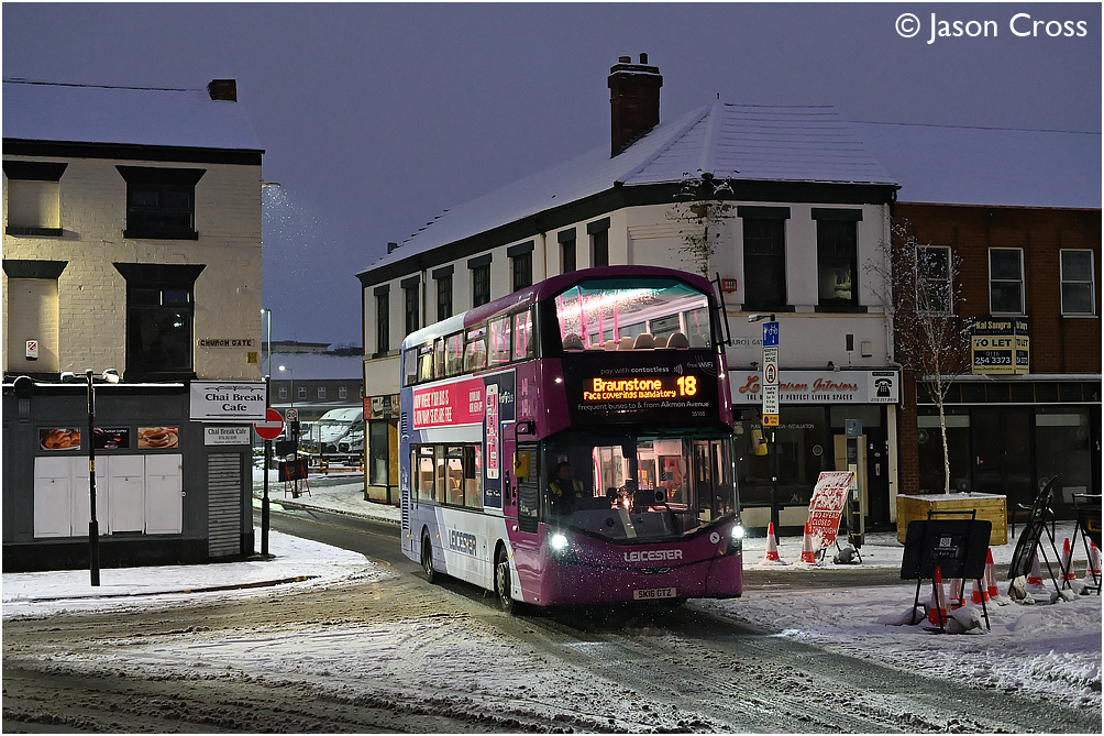 Leicester Buses in the Snow - First Leicester 35168 crosses Church Gate with a City Centre to Braunstone 18 service. Date: 24 January 2021 Manipulation Notes: None