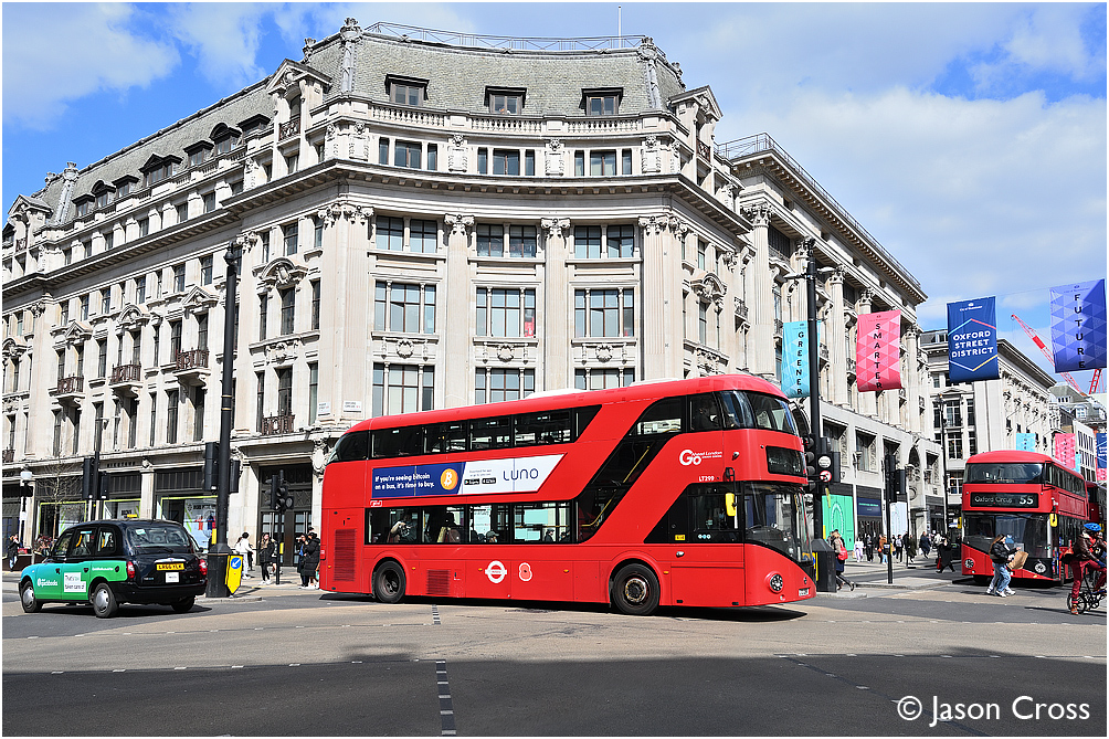 LT299, Oxford Circus, London (453 Marylebone to Deptford Bridge). Date: 16 April 2021 Manipulation Notes: None