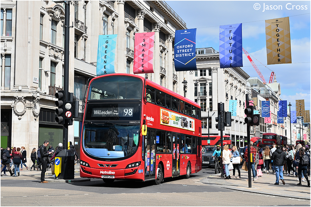 VWH2119, Oxford Circus, London (98 Holborn to Willesden Bus Garage). Date: 16 April 2021 Manipulation Notes: None