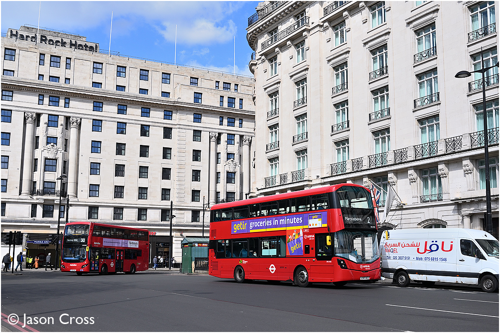 HV410 and VMH2467, Marble Arch, London (2 West Norwood to Marylebone and 30 Hackney Wick to Marble Arch). Date: 16 April 2021 Manipulation Notes: None