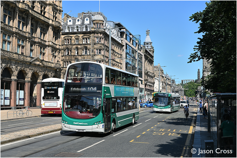 East Coast Buses 20937 and 10054, Princes Street, Edinburgh. Date: 17 July 2021 Manipulation Notes: None