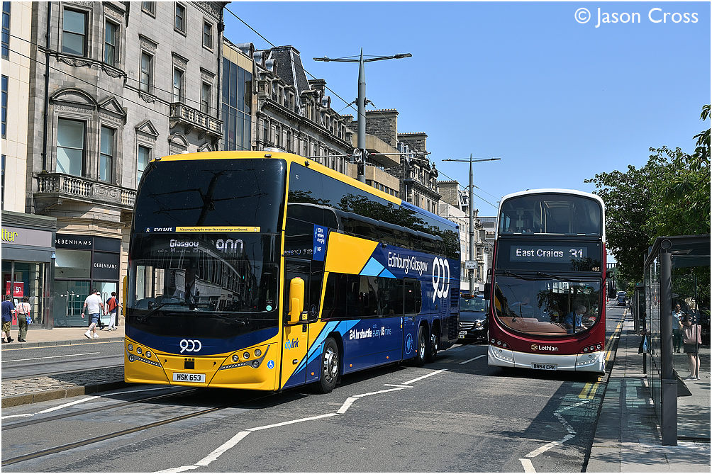 Parks of Hamilton (Edinburgh Glasgow 900 service) HSK653 / Lothian 405, Princes Street, Edinburgh. Date: 19 July 2021 Manipulation Notes: None