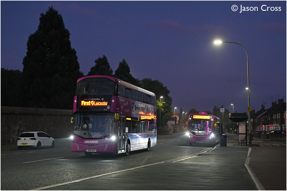 First Leicester's 35192 overtakes 63350 on Abbey Park Road, Leicester. Date: 9 October 2021 Manipulation Notes: None