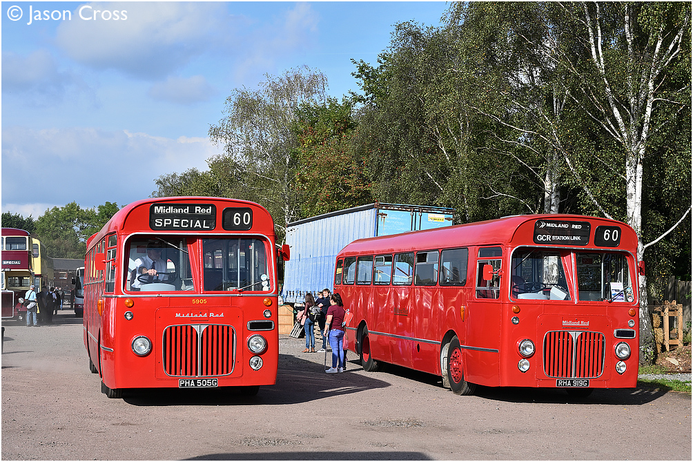 Midland Red BMMO S22 5905 and S23 5919, Quorn & Woodhouse station yard. Great Central Railway / Leicester Transport Heritage Trust Bus & Train Spectacular event. Date: 9 October 2021 Manipulation Notes: None