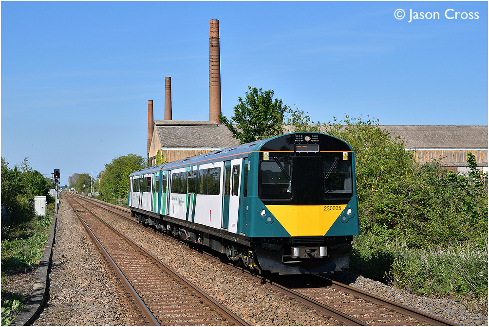 230005 slows for the Stewartby stop while working the 1555 Bedford to Bletchley service. Date: 14 May 2019 Manipulation Notes: None