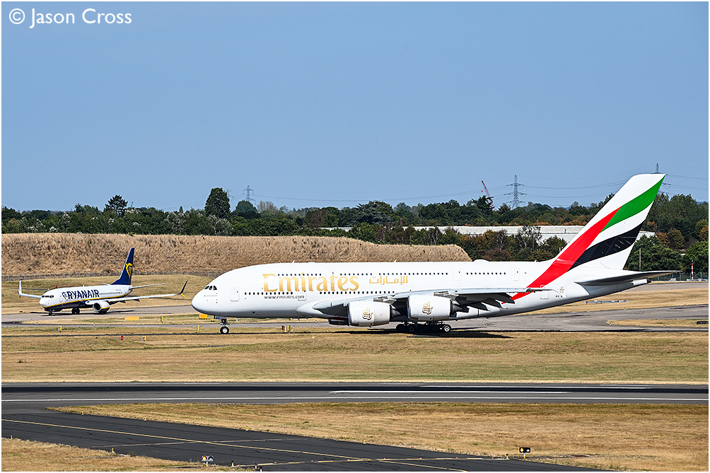 Emirates Airbus A380 A6-EUX taxiing to the runway at Birmingham Airport prior to departure to Dubai. Date: 25 August 2025 Manipulation Notes: None