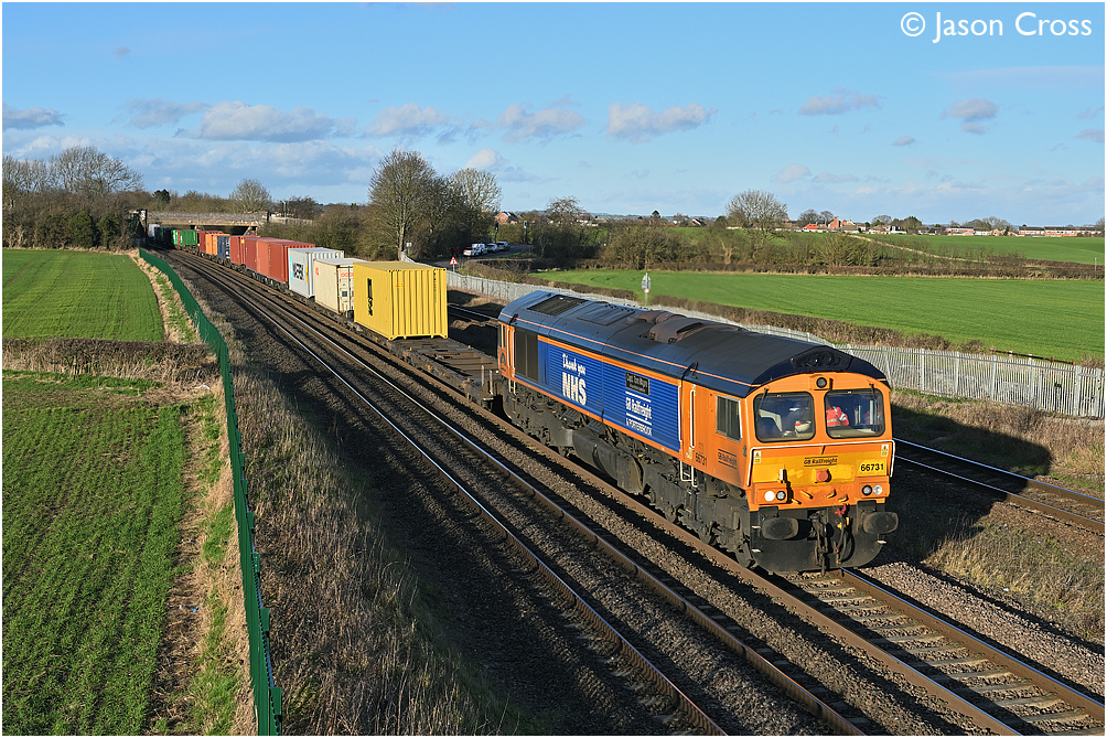 66731 'Captain Tom Moore' passes Thurmaston at the head of 4M29 1028 Felixstowe North to Birch Coppice container train. Date: 4 February 2022 Manipulation Notes: None Camera mounted on a tall pole and remotely fired