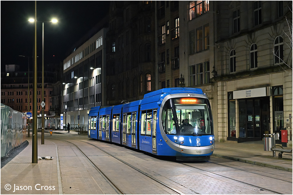 Midland Metro tram 28 pulls away from the Town Hall stop in Birmingham with a Wolverhampton St George's to Library service. Date: 19 February 2022 Manipulation Notes: None