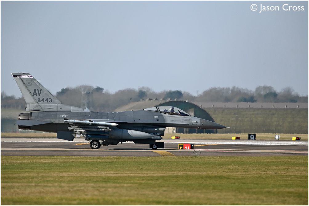 F16C 88-0443 taxies to runway 24 at RAF Lakenheath. (F16s were on a deployment to RAF Lakenheath from Aviano Air Base in Italy). Date: 11 March 2022 Manipulation Notes: None