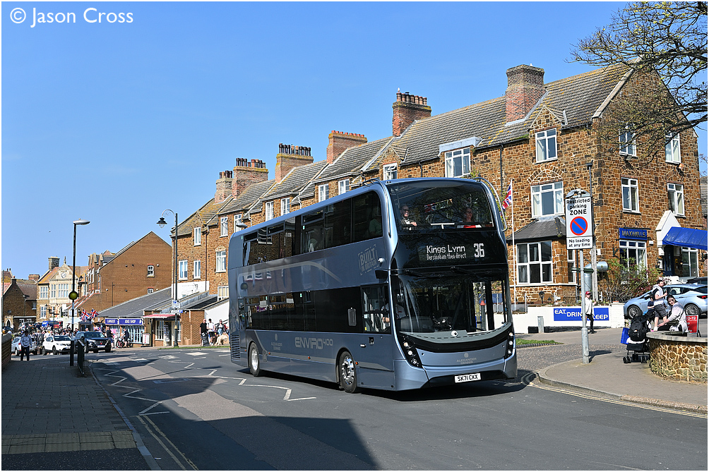 Enviro 400 demonstrator vehicle SK71 CKX approaching Hunstanton bus station with a 36 Wells-next-the-Sea to Kings Lynn service. Date: 16 April 2022 Manipulation Notes: None