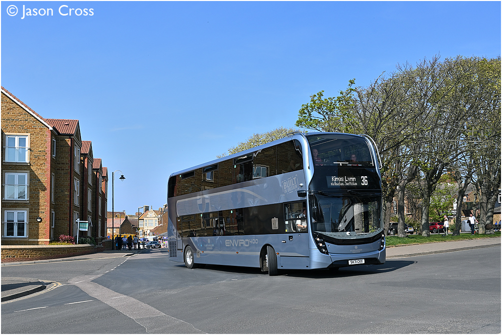 Enviro 400 demonstrator vehicle SK71 CKX departing Hunstanton bus station with a 36 Wells-next-the-Sea to Kings Lynn service. Date: 16 April 2022 Manipulation Notes: None