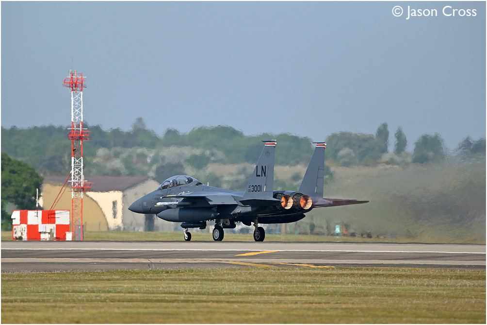 USAF F15E 00-3001 taking off from runway at RAF Lakenheath. Date: 9 May 2022 Manipulation Notes: None