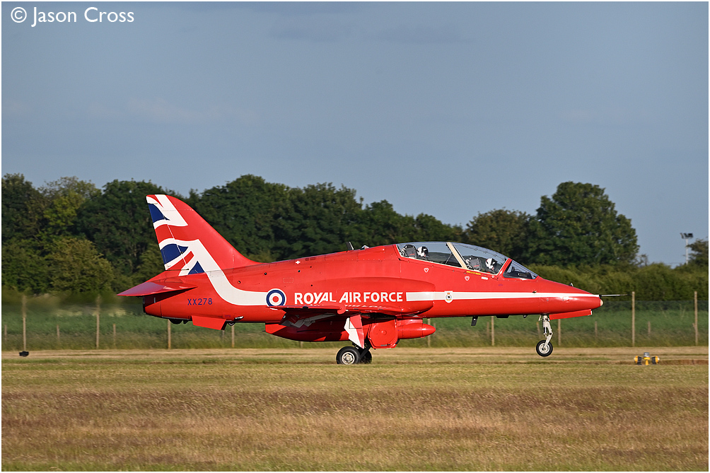RAF Red Arrow Hawk XX278 lands at RAF Scampton at the end of a transit flight from Bournemouth Airport. Date: 26 June 2022 Manipulation Notes: None