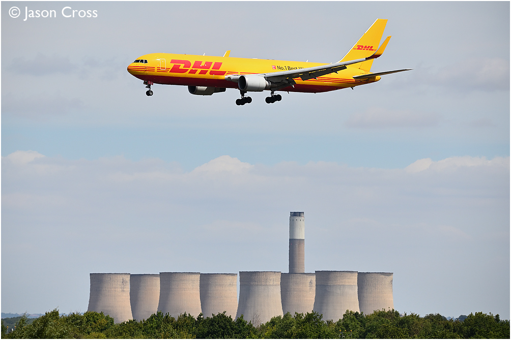 DHL Boeing 767 G-DHLE on final approach to East Midlands Airport runway 27 with a cargo flight from Leipzig.