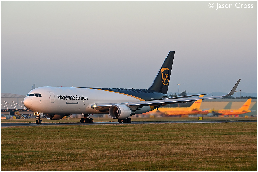 UPS Boeing 767 N346UP takes off from runway 09 at East Midlands Airport with a cargo flight for Philadelphia. Date: 13 August 2022 Manipulation Notes: None