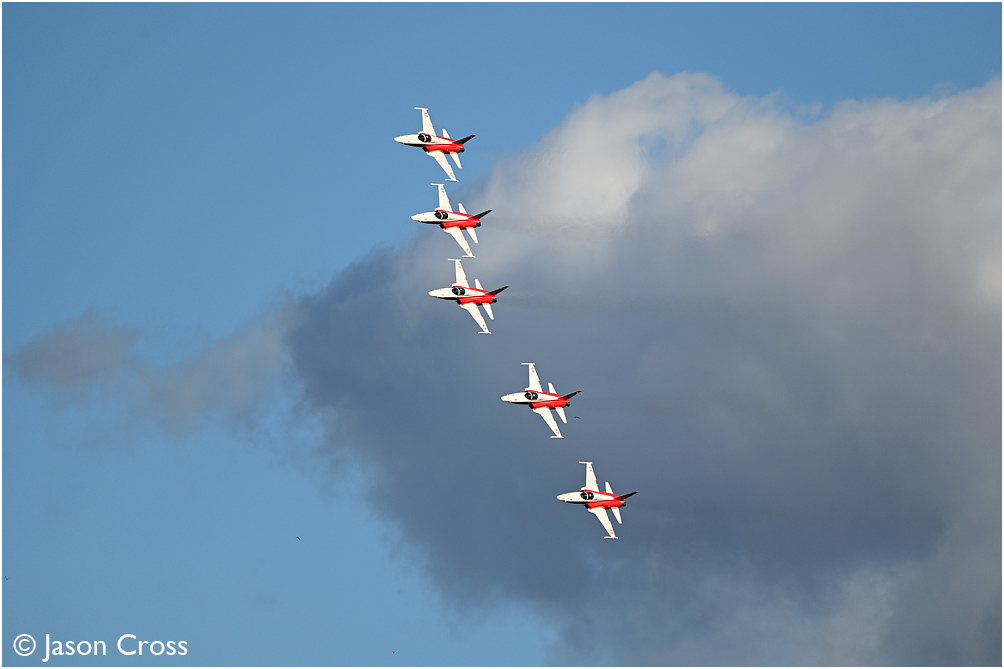 The Patrouille Suisse aerobatic team of the Swiss Air Force performing their display over Duxford in their Northrop F5-E Tiger II jets. Imperial War Museum Duxford Flying Finale Airshow. Date: 8 October 2022 Manipulation Notes: None