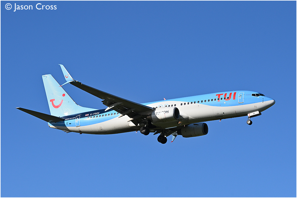 TUI Boeing 737 G-FDZX on final approach to runway 09 at East Midlands Airport with a flight from Zakynthos. Date: 18 October 2022 Manipulation Notes: None