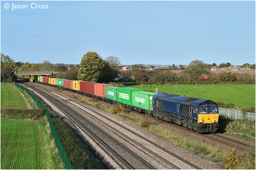 66304 passes Thurmaston with 4M33 1046 Felixstowe North to Hams Hall container train. Date: 26 October 2022 Manipulation Notes: None Camera mounted on a tall pole and remotely fired