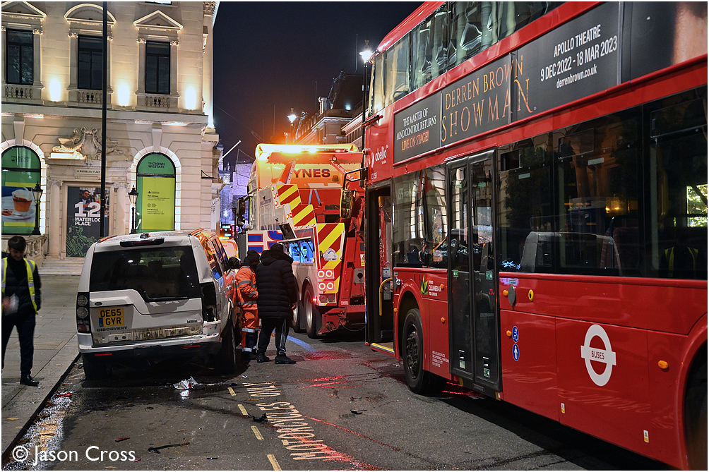 Waterloo Place in Westminster with LT155 involved in an incident. It would appear that the bus had smashed into the rear of a row of parked cars. Date: 20 November 2022 Manipulation Notes: None