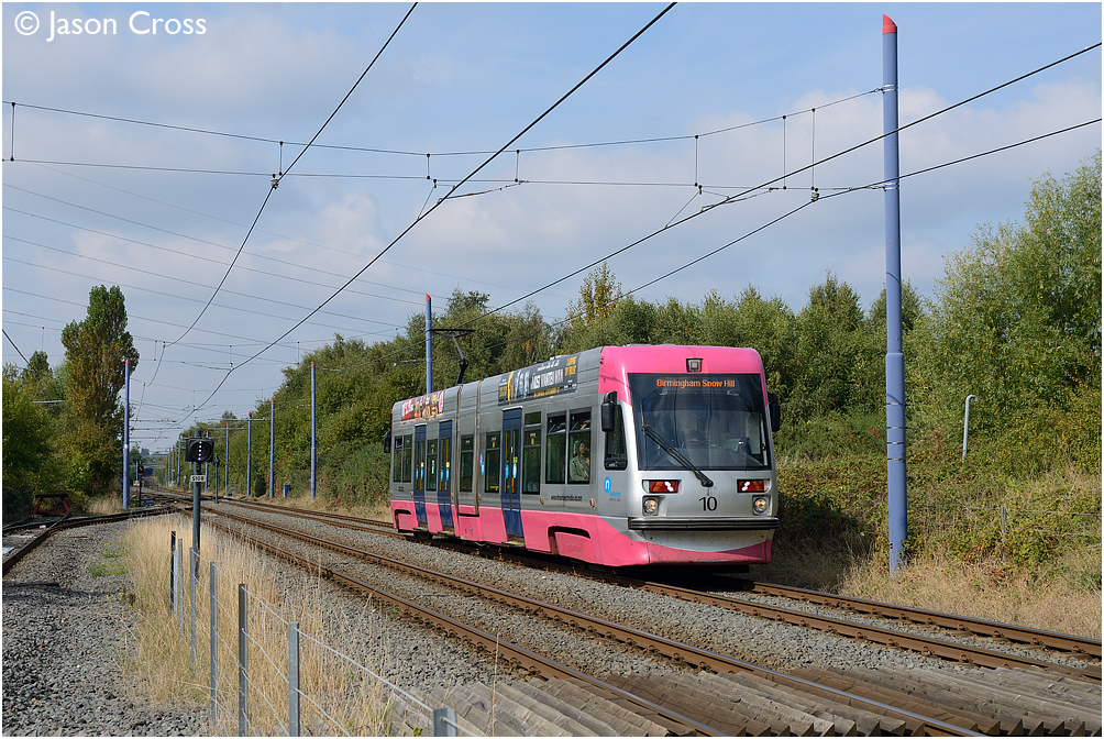 Tram 10 arrives at Wednesbury Parkway with a Wolverhampton St George's to Birmingham Snow Hill service. Date: 13 September 2014 Manipulation Notes: None