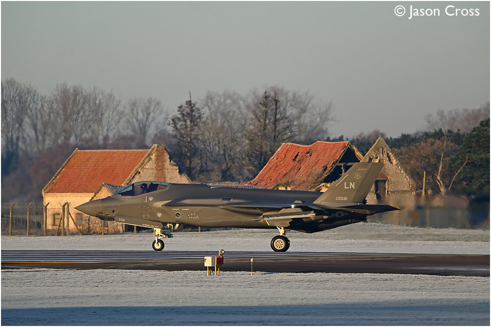 USAF F35A 20-5581 lining up on runway 24. RAF Lakenheath. Date: 15 December 2022 Manipulation Notes: None