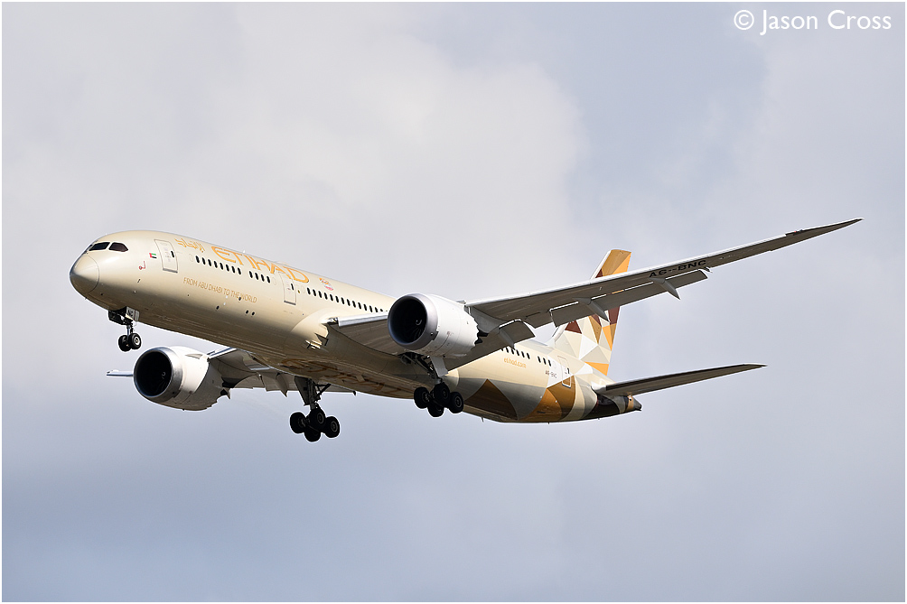 Etihad Boeing 787 A6-BNC. Flight ETD75F, 0825 Abu Dhabi to London Heathrow. London Heathrow Airport approach to runway 27R. Date: 13 April 2023 Manipulation Notes: None